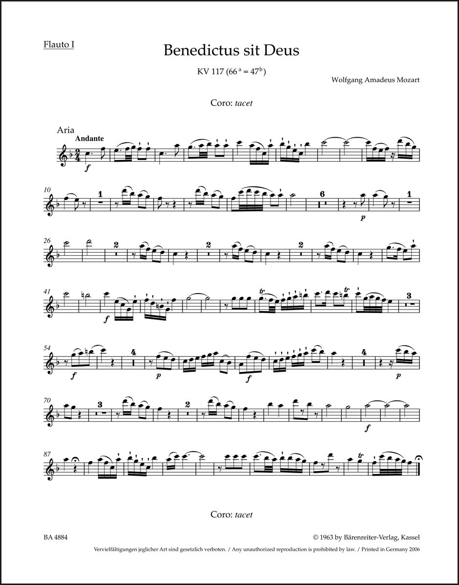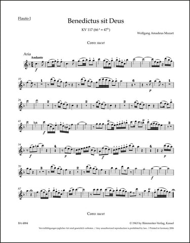 **Title**: Benedictus sit Deus K. 117 (66a=47b) | **Composer / Author**: Mozart, Wolfgang Amadeus | **Editor**: Federhofer, Hellmut | **Edition Type**: Wind set, Urtext edition | **Scoring/ Instrumentation**: 1. Flute, 2. Flute, 1. Horn, 2. Horn, 1. Trumpet, 2. Trumpet, Timpani | **Binding**: Folded | **Duration**: 00:11:00 | **Printing**: 2006 | **Weight**: 57.0 g | **Format**: 32,5 x 25,5 cm | **Pages**: 1/1/1/1/1/1/1 S. | **Language**: EN | Sample: https://data.baerenreiter.com/NB/BA/BA04884_65_9790006458837_nb_lrg_01.jpg