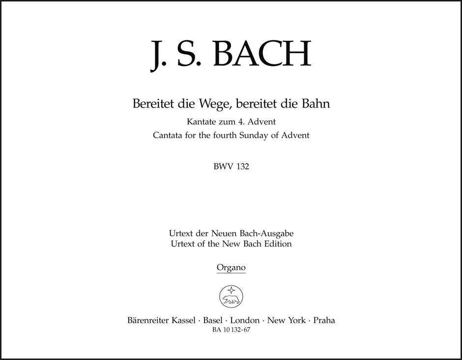 **Title**: Bereitet die Wege, bereitet die Bahn BWV 132 | **Subtitle**: Cantata for the 4th Sunday of Advent | **Composer / Author**: Bach, Johann Sebastian | **Editor**: Dürr, Alfred | **Edition Type**: Part, Urtext edition | **Scoring/ Instrumentation**: Organ | **Binding**: Stapled | **Weight**: 81.0 g | **Format**: 23,0 x 29,5 cm | **Pages**: 23 S. | **Language**: EN | Sample: https://data.baerenreiter.com/NB/BA/BA10132_67_9790006491018_nb_lrg_01.jpg