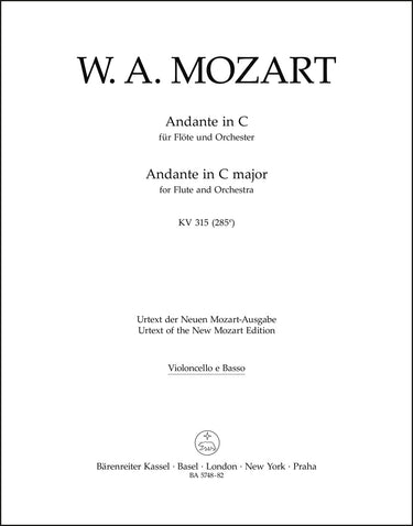 **Title**: Andante for Flute and Orchestra in C major K. 315 (285e) | **Composer / Author**: Mozart, Wolfgang Amadeus | **Editor**: Giegling, Franz | **Edition Type**: Part, Urtext edition | **Scoring/ Instrumentation**: Violoncello, Double bass | **Binding**: Folded | **Duration**: 00:06:00 | **Weight**: 17.0 g | **Format**: 32,5 x 25,5 cm | **Pages**: 3 S. | **Language**: EN | Sample: https://data.baerenreiter.com/NB/BA/BA05748_82_9790006525058_nb_lrg_01.jpg
