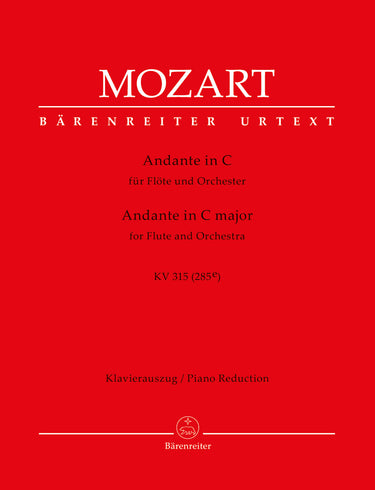 **Title**: Andante for Flute and Orchestra in C major K. 315 (285e) | **Comments on Version**: With cadenzas by Rachel Brown and Karl Engel | **Composer / Author**: Mozart, Wolfgang Amadeus | **Arranger**: Schelhaas, Martin | **Editor**: Giegling, Franz | **Edition Type**: Piano reduction, Part, Urtext edition | **Scoring/ Instrumentation**: Flute solo, Piano | **Binding**: Stapled | **Duration**: 00:06:00 | **Printing**: 5th printing 2020 | **Weight**: 131.0 g | **Format**: 31,0 x 24,3 cm | **Pages**: III, 6/7/3 S. | **Language**: EN | Sample: https://data.baerenreiter.com/NB/BA/BA05748_90_9790006520022_nb_lrg_01.jpg