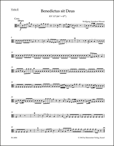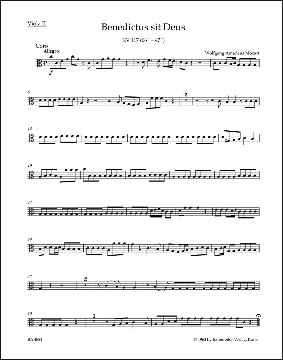 **Title**: Benedictus sit Deus K. 117 (66a=47b) | **Composer / Author**: Mozart, Wolfgang Amadeus | **Editor**: Federhofer, Hellmut | **Edition Type**: Part, Urtext edition | **Scoring/ Instrumentation**: 2. Viola | **Binding**: Folded | **Duration**: 00:11:00 | **Printing**: 2006 | **Weight**: 15.0 g | **Format**: 32,5 x 25,5 cm | **Pages**: 3 S. | **Language**: EN | Sample: https://data.baerenreiter.com/NB/BA/BA04884_80_9790006458882_nb_lrg_01.jpg