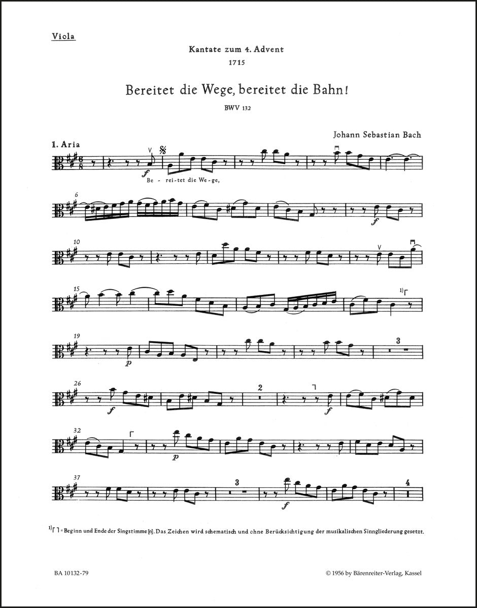 **Title**: Bereitet die Wege, bereitet die Bahn BWV 132 | **Subtitle**: Cantata for the 4th Sunday of Advent | **Composer / Author**: Bach, Johann Sebastian | **Editor**: Dürr, Alfred | **Edition Type**: Part, Urtext edition | **Scoring/ Instrumentation**: Viola | **Binding**: Stapled | **Weight**: 18.0 g | **Format**: 32,5 x 25,5 cm | **Pages**: 3 S. | **Language**: EN | Sample: https://data.baerenreiter.com/NB/BA/BA10132_79_9790006491049_nb_lrg_01.jpg