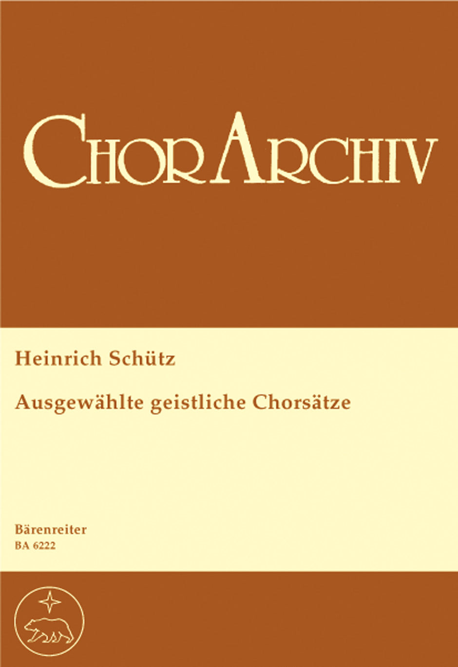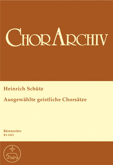 **Title**: Ausgewählte geistliche Chorsätze | **Subtitle**: Überwiegend vierstimmge, einige fünf-, sechs- und achtstimmige Sätze, teilweise mit Basso continuo | **Composer / Author**: Schutz, Heinrich | **Edition Type**: Choral score, Anthology | **Instrumentation**: Choir | **Scoring/ Instrumentation**: Mixed choir (SATB) | **Binding**: Stapled | **Level of Difficulty**: 3.0 | **Printing**: 3. Aufl. 2008 | **Weight**: 92.0 g | **Format**: 27,0 x 19,0 cm | **Pages**: 32 S. | **Language**: EN | Sample: https://data.baerenreiter.com/NB/BA/BA06222_00_9790006477142_nb_lrg_01.jpg