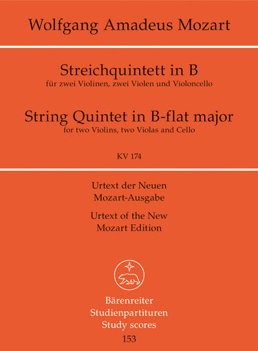 **Title**: Streichquintett B-Dur KV 174 | **Composer / Author**: Mozart, Wolfgang Amadeus | **Editor**: Schmid, Ernst Fritz | **Edition Type**: Study score, Urtext edition | **Binding**: Stapled | **Weight**: 84.0 g | **Format**: 22,5 x 16,5 cm | **Pages**: IV, 35 S. | **Language**: EN | Sample: https://data.baerenreiter.com/NB/TP/TP00153_00_9790006201310_nb_lrg_01.jpg