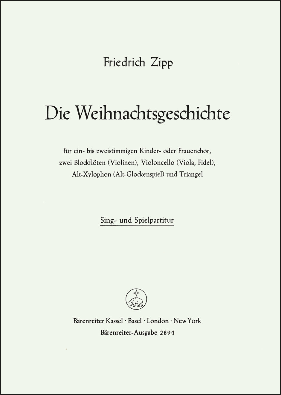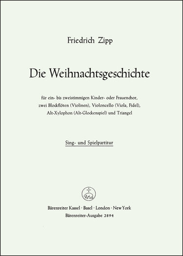 **Title**: Die Weihnachtsgeschichte | **Composer / Author**: Zipp, Friedrich | **Edition Type**: Score | **Scoring/ Instrumentation**: Children's choir (Female choir), Treble recorders (2), Descant recorders (2), Alto xylophone, Triangle, Violoncello | **Binding**: Stapled | **Level of Difficulty**: 2.0 | **Weight**: 40.0 g | **Format**: 27,0 x 19,0 cm | **Pages**: 14 S. | **Language**: EN | Sample: https://data.baerenreiter.com/NB/BA/BA02894_00_9790006427031_nb_lrg_01.jpg