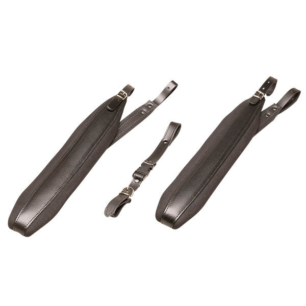 Padded straps for accordion with leather safety strap. Manufactured with leather and velvet. Polyethylene padded. Maximum lenght 110cm. Minimum lenght 78cm.