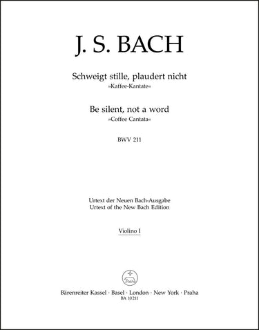 **Title**: Be quiet, chatter not BWV 211 "Coffee Cantata" | **Comments on Version**: Study score = TP 1211 | **Composer / Author**: Bach, Johann Sebastian | **Editor**: Neumann, Werner | **Edition Type**: Part, Urtext edition | **Scoring/ Instrumentation**: 1. Violin | **Binding**: Stapled | **Printing**: 1st printing 2006 | **Weight**: 31.0 g | **Format**: 32,5 x 25,5 cm | **Pages**: 7 S. | **Language**: EN | Sample: https://data.baerenreiter.com/NB/BA/BA10211_74_9790006533237_nb_lrg_01.jpg