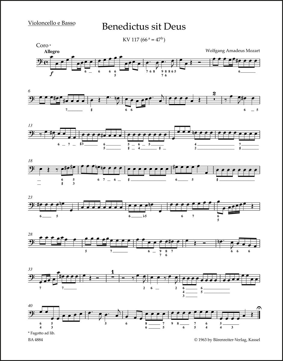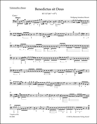 **Title**: Benedictus sit Deus K. 117 (66a=47b) | **Composer / Author**: Mozart, Wolfgang Amadeus | **Editor**: Federhofer, Hellmut | **Edition Type**: Part, Urtext edition | **Scoring/ Instrumentation**: Violoncello, Double bass | **Binding**: Folded | **Duration**: 00:11:00 | **Printing**: 2006 | **Weight**: 15.0 g | **Format**: 32,5 x 25,5 cm | **Pages**: 3 S. | **Language**: EN | Sample: https://data.baerenreiter.com/NB/BA/BA04884_82_9790006458899_nb_lrg_01.jpg