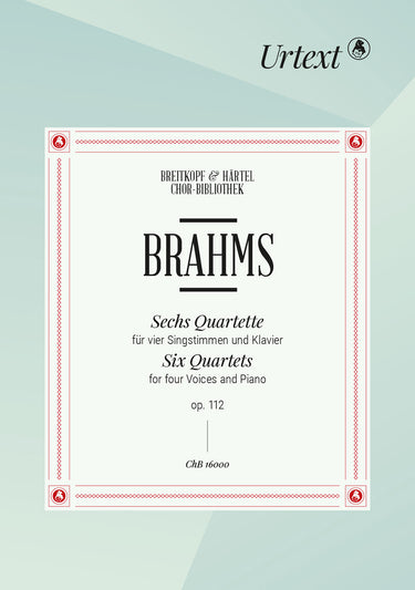 6 Quartets Op. 112 | Urtext from the new Brahms Complete Edition | 4vce,pno | Choir | Chorus | Chorus (with soloists) and piano | Romantic | Sheet Music | choral score | Bernd Wiechert | | 48 | German | stapled | 19 x 27 cm