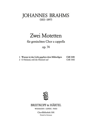2 Motets Op. 74 | Urtext based on the Brahms Complete Edition of the Gesellschaft der Musikfreunde in Vienna | No. 1 Warum ist das Licht gegeben | mix ch | Choir | Chorus | Chorus a cappella | Romantic | Motet | Sheet Music | choral score | | | 12 | German | stapled | 19 x 27 cm