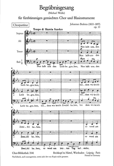 Begräbnisgesang Op. 13 | „Nun lasst uns den Leib begraben“ – Urtext based on the Brahms Complete Edition of the Gesellschaft der Musikfreunde in Vienna | mix ch,wind insts | choir: SATBB – 0.2.2.2 – 2.0.3.1 – timp | Choir | Chorus | Chorus with inst. | 10' | Romantic | Requiem | Sheet Music | choral score | | | 8 | stapled | 19 x 27 cm