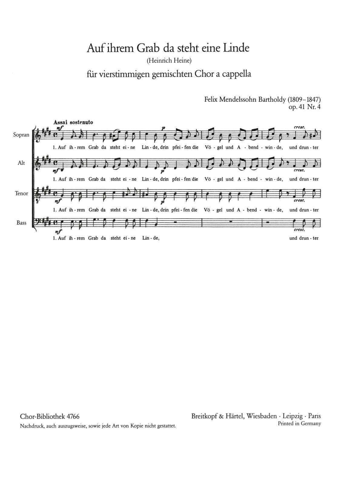 6 Lieder Op. 41 | 4. Auf ihrem Grab da steht eine Linde MWV F 6 | mix ch | Choir | Chorus | Chorus a cappella | Romantic | Song | Sheet Music | choral score | | | 2 | German | 19 x 27 cm