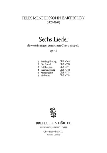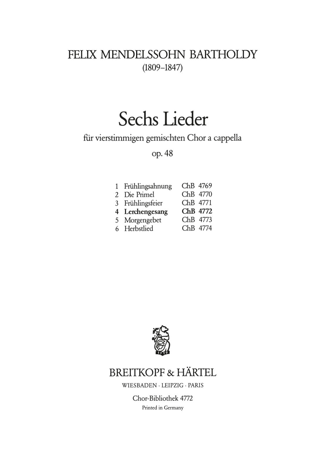 6 Lieder Op. 48 | 4. Lerchengesang „Wie lieblicher Klang“ MWV F 13 | mix ch | Choir | Chorus | Chorus a cappella | Romantic | Song | Sheet Music | choral score | | | 4 | German | stapled | 19 x 27 cm