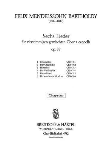 6 Lieder [Op. 88] | 2. Der Glückliche „Ich hab ein Liebchen“ MWV F 27 | mix ch | Choir | Chorus | Chorus a cappella | Romantic | Song | Sheet Music | choral score | | | 4 | German | 19 x 27 cm