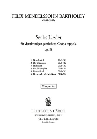 6 Lieder [Op. 88] | 6. Der wandernde Musikant „Durch Feld und Buchenhallen“ MWV F 19 | mix ch | Choir | Chorus | Chorus a cappella | Romantic | Song | Sheet Music | choral score | | | 4 | German | 19 x 27 cm