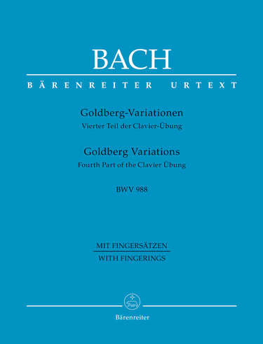 **Title**: Goldberg Variations BWV 988 | **Subtitle**: Fourth Part of the Clavier Übung | **Comments**: Edition without fingering see BA 5162 | **Comments on Version**: Fingering by Ragna Schirmer | **Composer / Author**: Bach, Johann Sebastian | **Editor**: Wolff, Christoph | **Preface**: Wolff, Christoph / Schirmer, Ragna | **Edition Type**: Performance score, Urtext edition | **Instrumentation**: Piano | **Scoring/ Instrumentation**: Piano | **Binding**: Stapled | **Level of Difficulty**: 6.0 | **Printing**: 4th printing 2021 | **Weight**: 257.0 g | **Format**: 31,0 x 24,3 cm | **Pages**: VI, 47 S. | **Language**: EN | Sample: https://data.baerenreiter.com/NB/BA/BA10848_00_9790006543175_nb_lrg_01.jpg