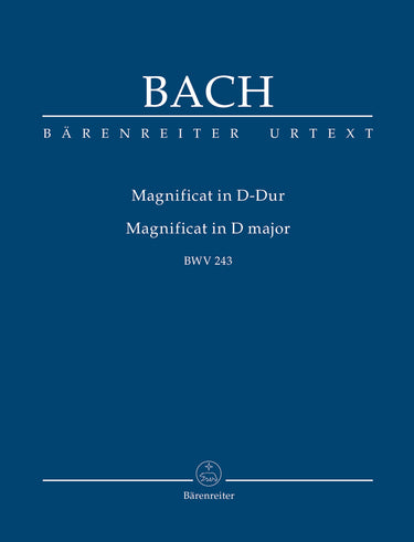 **Title**: Magnificat in D major BWV 243 | **Composer / Author**: Bach, Johann Sebastian | **Editor**: Dürr, Alfred | **Preface**: Dürr, Alfred | **Edition Type**: Study score, Urtext edition | **Binding**: Stapled | **Level of Difficulty**: 3.0 | **Duration**: 00:30:00 | **Printing**: 15th printing 2017 | **Language of Text Part**: Latin | **Weight**: 137.0 g | **Format**: 22,5 x 16,5 cm | **Pages**: VI, 58 S. | **Language**: EN | Sample: https://data.baerenreiter.com/NB/TP/TP00002_00_9790006200016_nb_lrg_01.jpg