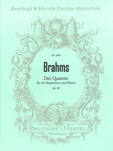 3 Quartets Op. 64 | Urtext based on the Brahms Complete Edition of the Gesellschaft der Musikfreunde in Vienna | solos,mix ch,pno | (solos: SATB) – choir: SATB – pno | Choir | Chorus | Chorus (with soloists) and piano | Romantic | Song | Sheet Music | full score | | | 28 | stapled | 23 x 30,5 cm