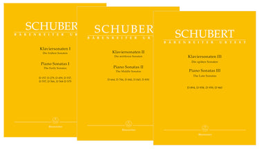 **Title**: Piano Sonatas I-III | **Comments**: Set of BA09642, BA09643, BA09644 | **Comments on Version**: With notes on performance practice by Mario Aschauer | **Composer / Author**: Schubert, Franz | **Editor**: Litschauer, Walburga | **Edition Type**: Performance score, Anthology, Urtext edition | **Instrumentation**: Piano | **Scoring/ Instrumentation**: Piano | **Binding**: Paperback | **Level of Difficulty**: 4.0 | **Printing**: 1st printing 2023 | **Weight**: 2418.0 g | **Format**: 31,0 x 24,3 cm | **Pages**: XXXII, 182 / XXXIII, 150 / XXVIII, 177 S. | **Language**: EN | Sample: https://data.baerenreiter.com/NB/BA/BA10889_00_9790006577415_nb_lrg_01.jpg