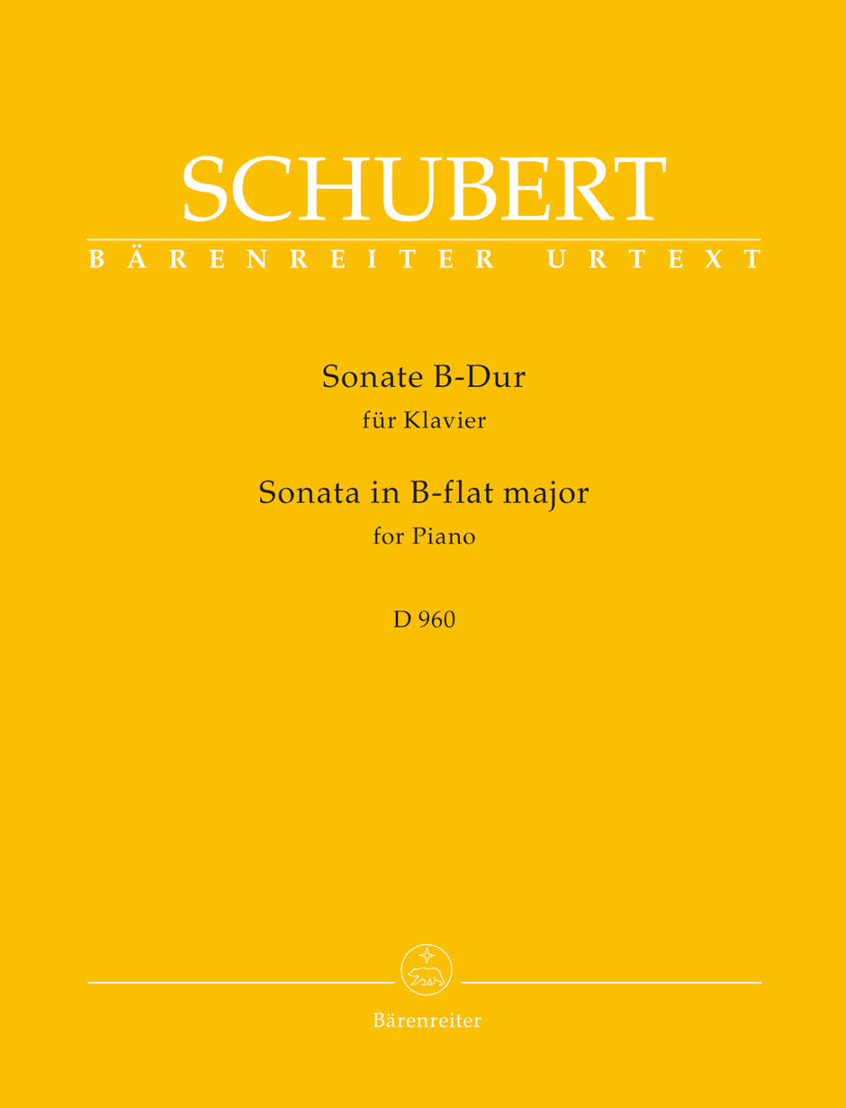 **Title**: Sonata for Piano in B-flat major D 960 | **Comments**: Replaces BA 5634 | **Comments on Version**: Fingering and notes on performance practice by Mario Aschauer; Drafts of the sonata under https://www.baerenreiter.com/en/shop/produkt/details/BA10860/ (Extras) | **Composer / Author**: Schubert, Franz | **Editor**: Litschauer, Walburga | **Preface**: Litschauer, Walburga | **Edition Type**: Performance score, Urtext edition | **Instrumentation**: Piano | **Scoring/ Instrumentation**: Piano | **Binding**: Stapled | **Level of Difficulty**: 5.0 | **Printing**: 3rd printing 2021 | **Weight**: 296.0 g | **Format**: 31,0 x 24,3 cm | **Pages**: XVI, 47 S. | **Language**: EN | Sample: https://data.baerenreiter.com/NB/BA/BA10860_00_9790006543533_nb_lrg_01.jpg